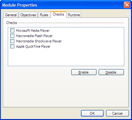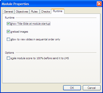 Use “Checks” tab to specify names of the software components that need to be checked for availability on student’s computer prior to launching Module. On “Runtime” tab you can specify some Module runtime parameters, such as: Show Title-Slide at Module Startup - if this checkbox is unchecked Title-Slide will be automatically skipped. Preload images - allows preloading all images of particular Slide before display. Usually this feature causes some delay (with "Loading images" progress bar) before transition to the Slide but then all the images of the Slide will be displayed much faster. Allow viewing Slides in sequential order only - this feature disables transition on the Slide that is unvisited yet and is not the next to last visited Slide in line. Transition to any visited Slide is not restricted. Scale module score to 100% - legacy feature. Modern e-Learning standards include special parameters for raw and scaled score.